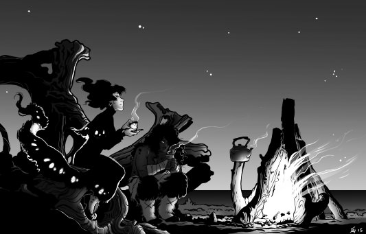 In addition to your illustration work, you write speculative fiction. How does the process of creating a story compare to the process of creating visual art (or vice versa)?