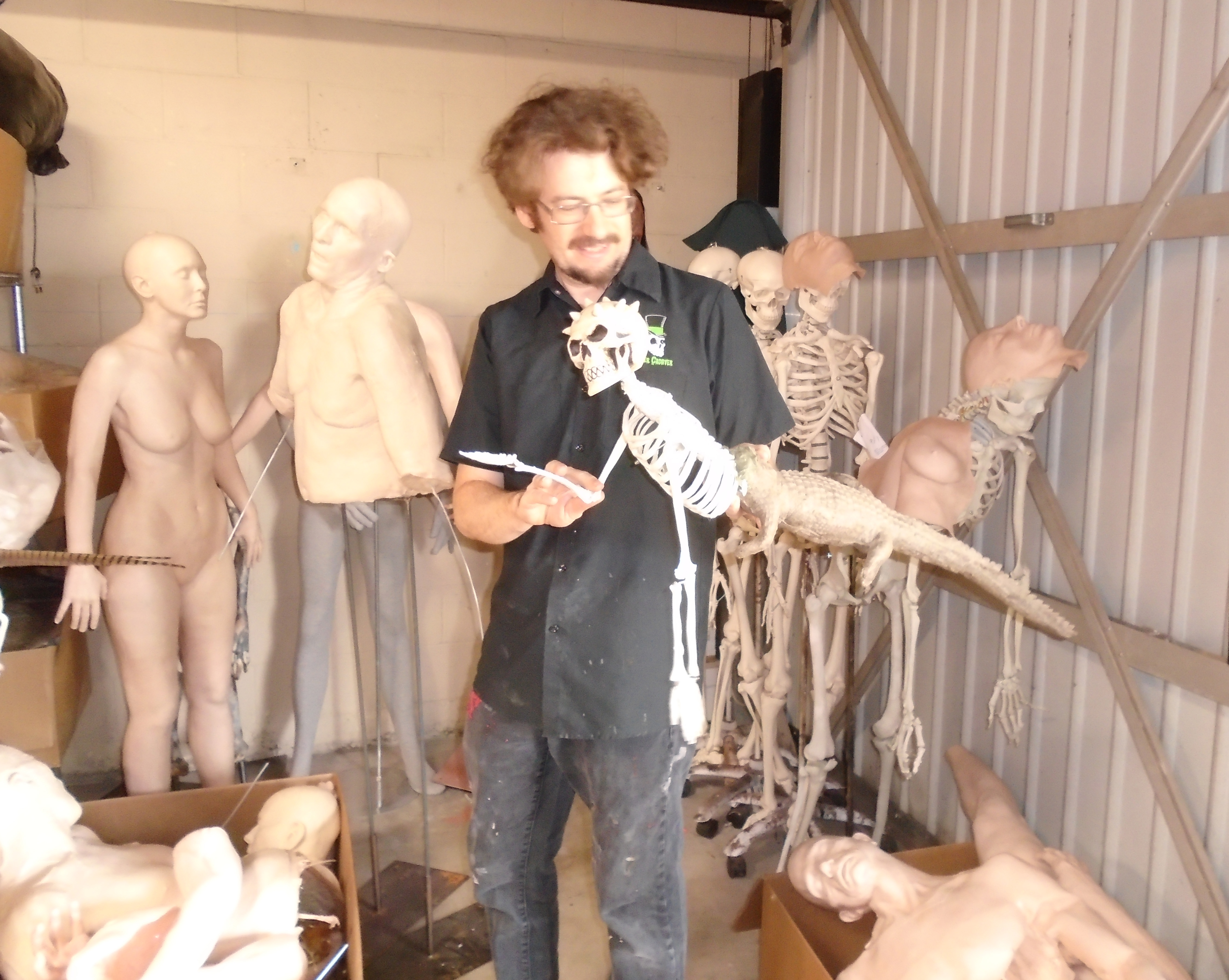 Tucked away behind an unassuming warehouse façade at the far eastern end of the San Fernando Valley is one of the most gleefully horrific places in Southern California: Dapper Cadaver. Founded in 2006 by husband and wife team BJ and Eileen Winslow, Dapper Cadaver is a horror prop shop that services the film and television industries, haunted attractions, amusement parks, carnival sideshows, private parties, and even disaster preparedness training courses. In their spacious and attractive facility, clients can visit the “Oddities Room” for sideshow displays, find a complete dead pirate figure or towering werewolf in the “Halloween Room,” examine a selection of skulls, peruse vintage medical equipment, or gape at an actual-size Tyrannosaurus Rex skeleton. BJ—who, in the heat of summer is already well into his Halloween season—took time out to chat with us about what it’s like to make a living from creating three-dimensional nightmares.